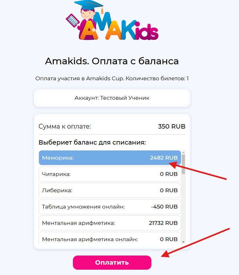 Если ученик авторизован на платформе AMAkids https://amakids.ru/platform, нужно выбрать курс, с баланса которого произойдет списание денег за билет и нажать на кнопку "Оплатить". (Кнопка "Оплатить" станет активной только при выборе баланса с достаточной суммой)