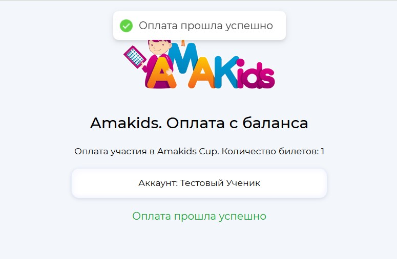 После успешной оплаты будет отображено сообщение об успехе и билеты отобразятся в личном кабинете участника на сайте чемпионата, в разделе "Билеты" https://cup.amakids.ru/