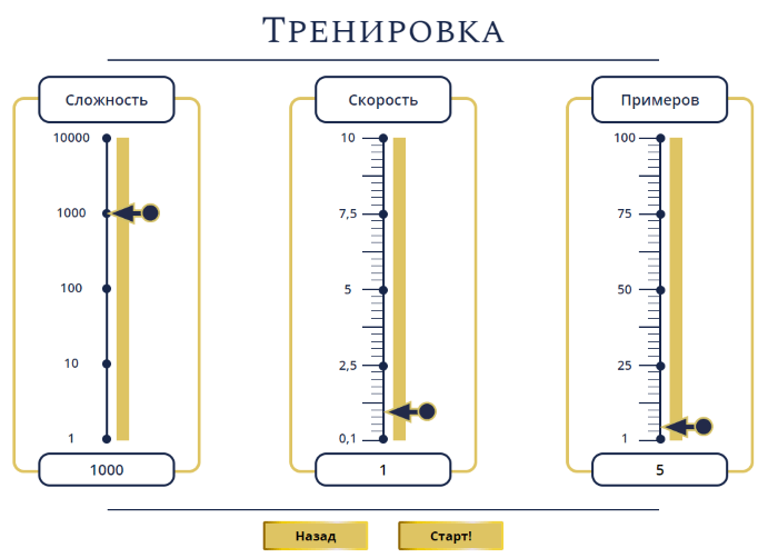 Здесь вы самостоятельно выставляете настройки игры: сложность (разрядность), скорость и количество чисел в примере.