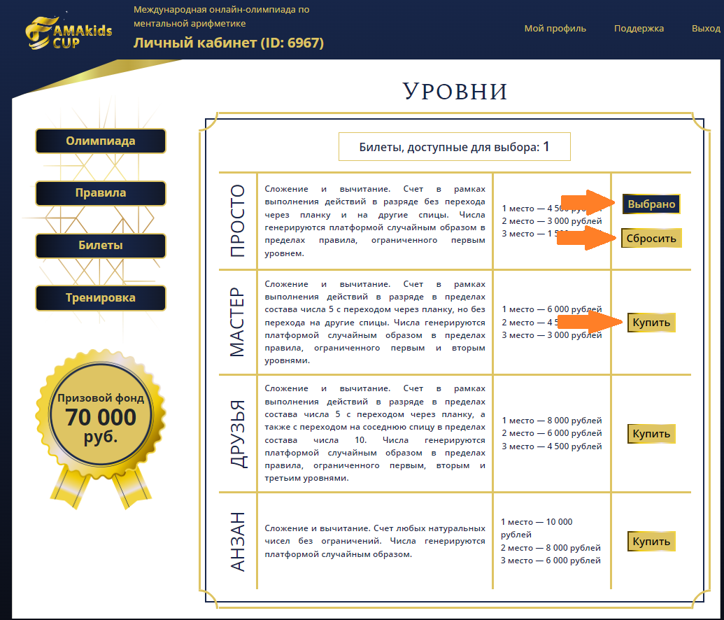 5.5. Потренировавшись на платформе вы можете выбрать еще уровни, в которых будете участвовать. Максимальное количество уровней – четыре. При покупке нескольких билетов дважды участвовать в одном уровне нельзя.
