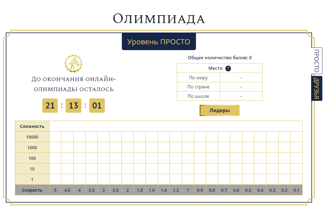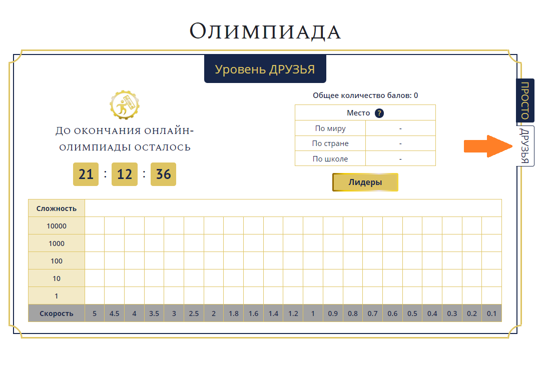 Олимпиадные задания будут доступны на главной странице Личного кабинета в таблице. Например, вы хотите начать участие в олимпиаде со сложности 10 (двузначные) и скорости 0,9 сек. Вы нажимаете на квадратик на пересечении этих значений и сразу попадаете в игру, минуя страницу настроек, так как эти настройки уже заложены. Обратите внимание на вкладки справа. На скриншоте вы видите, что активна вкладка "Друзья". Это значит, открыта страница олимпиады для уровня "Друзья".