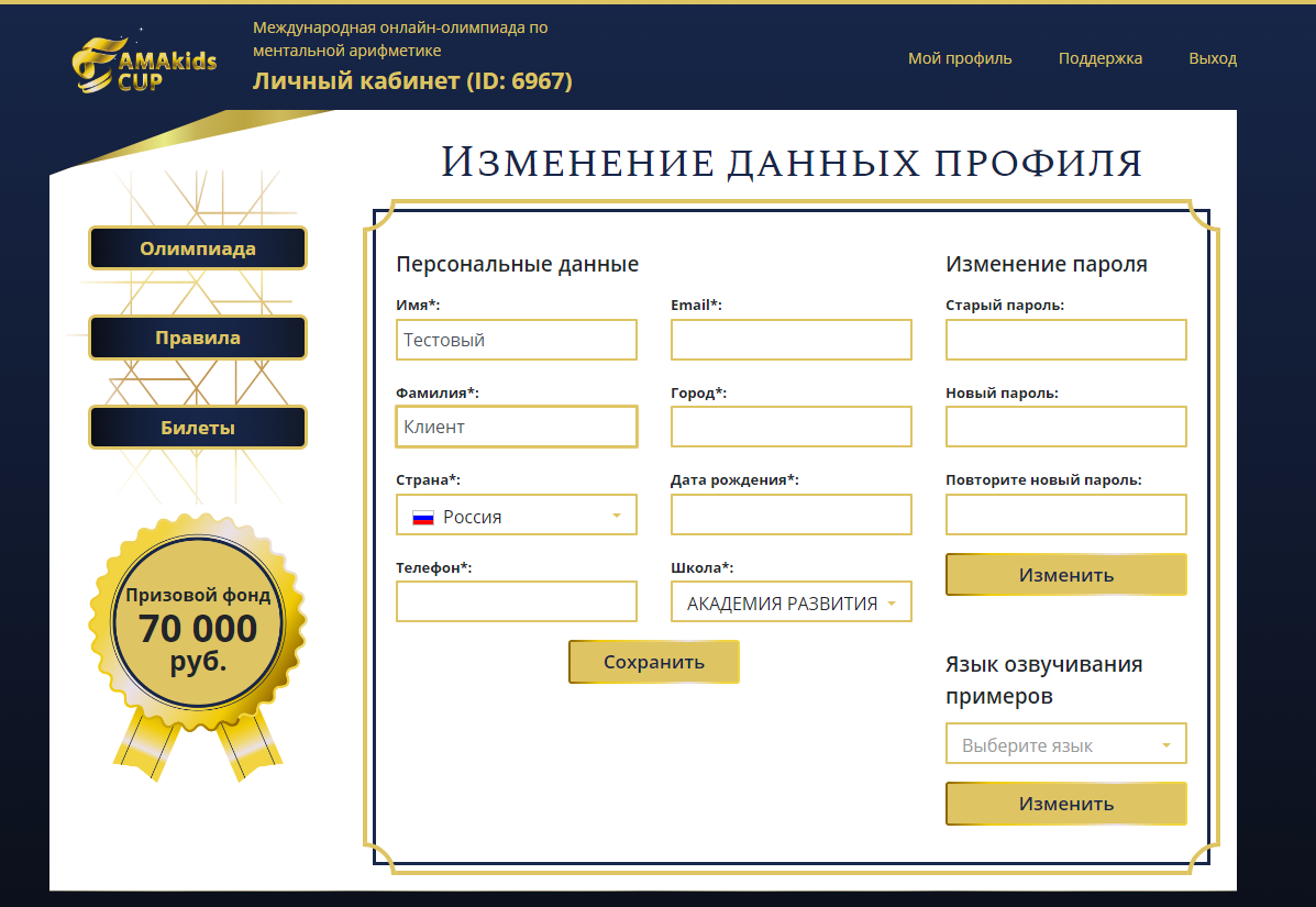 5.2. После успешной регистрации у вас появится доступ в Личный кабинет. Для участия в AMAKIDS CUP вам необходимо указать данные: страна, номер телефона. Также нужно еще и подтвердить номер телефона. Без этих данных не будет возможности перейти к оплате. Указать эти данные вы можете на странице «Мой профиль».