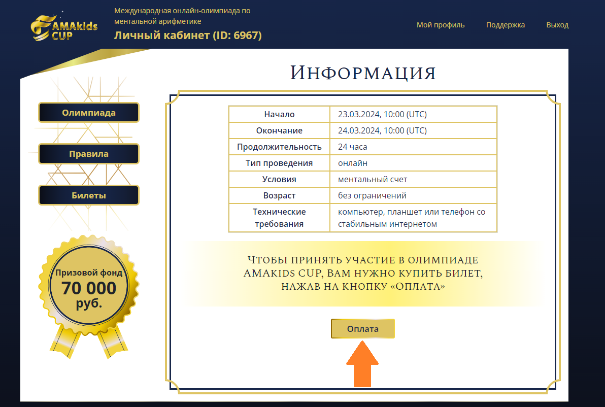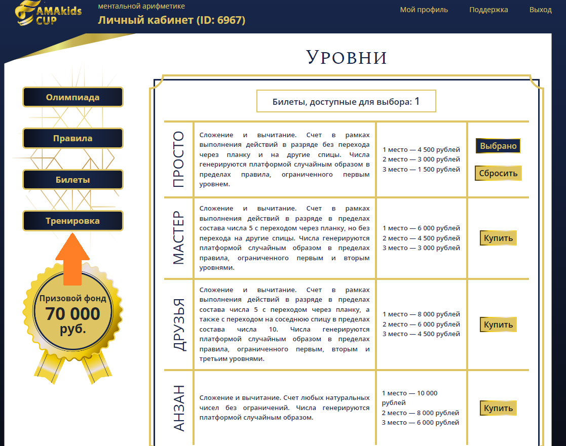 5.4. Сразу после оплаты хотя бы одного билета вам будет доступна тренировка на платформе AMAKIDS CUP. Зайти в нее вы сможете, нажав на кнопку «ТРЕНИРОВКА».