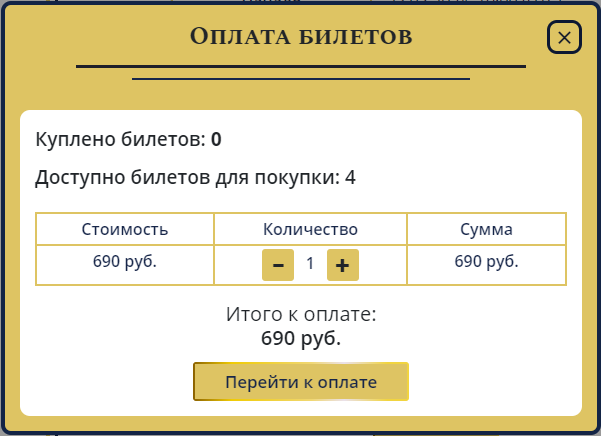 Максимум у одного участника может быть 4 билета. Для завершения оплаты нажмите на кнопку “Перейти к оплате”. Вы будете переадресованы на страницу оплаты.