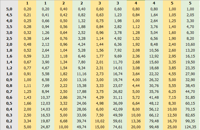 В таблице вертикальная шкала – скорость, горизонтальная – разрядность. В зеленых столбцах даются баллы за скорость, в желтых отображается суммарная скорость за предыдущие примеры. Например, ребенок сразу посчитал и подтвердил пример на скорости 0,6, однозначные. Ему сразу начисляется 10,37 баллов.
